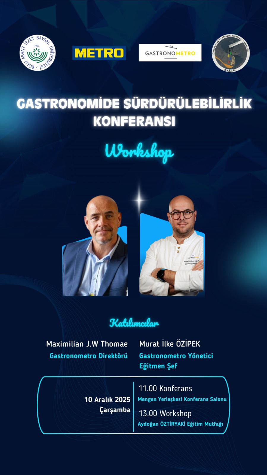 Gastronomi ve Mutfak Sanatları Bölümü tarafından Gastronometro iş birliğiyle 10 Aralık 2025 Çarşamba günü “Gastronomide Sürdürülebilirlik ve Workshop” etkinliği düzenlendi. Etkinliğe Gastronometro Direktörü Maximillian J. W. Thomae ile Gastronometro Yönetici Eğitmen Şefi Murat İlke Özipek katılım sağladı.